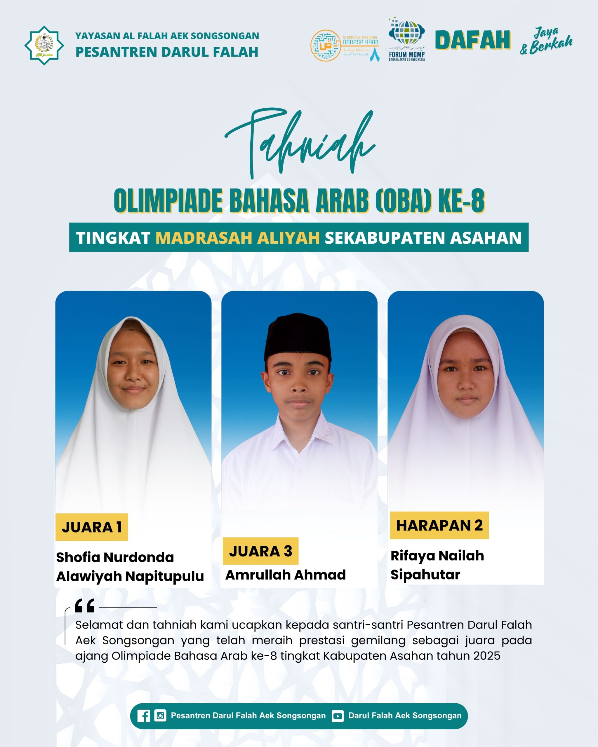 Olimpiade Bahasa Arab ini diikuti oleh perwakilan Madrasah Aliyah dari seluruh penjuru Kabupaten Asahan, menjadikan kompetisi ini sangat ketat dan bergengsi. Santri Pesantren Darul Falah menunjukkan kemampuan yang luar biasa dalam penguasaan kaidah bahasa Arab, tata bahasa (nahwu sharaf), membaca, menulis, hingga kemampuan berbicara (muhadatsah).