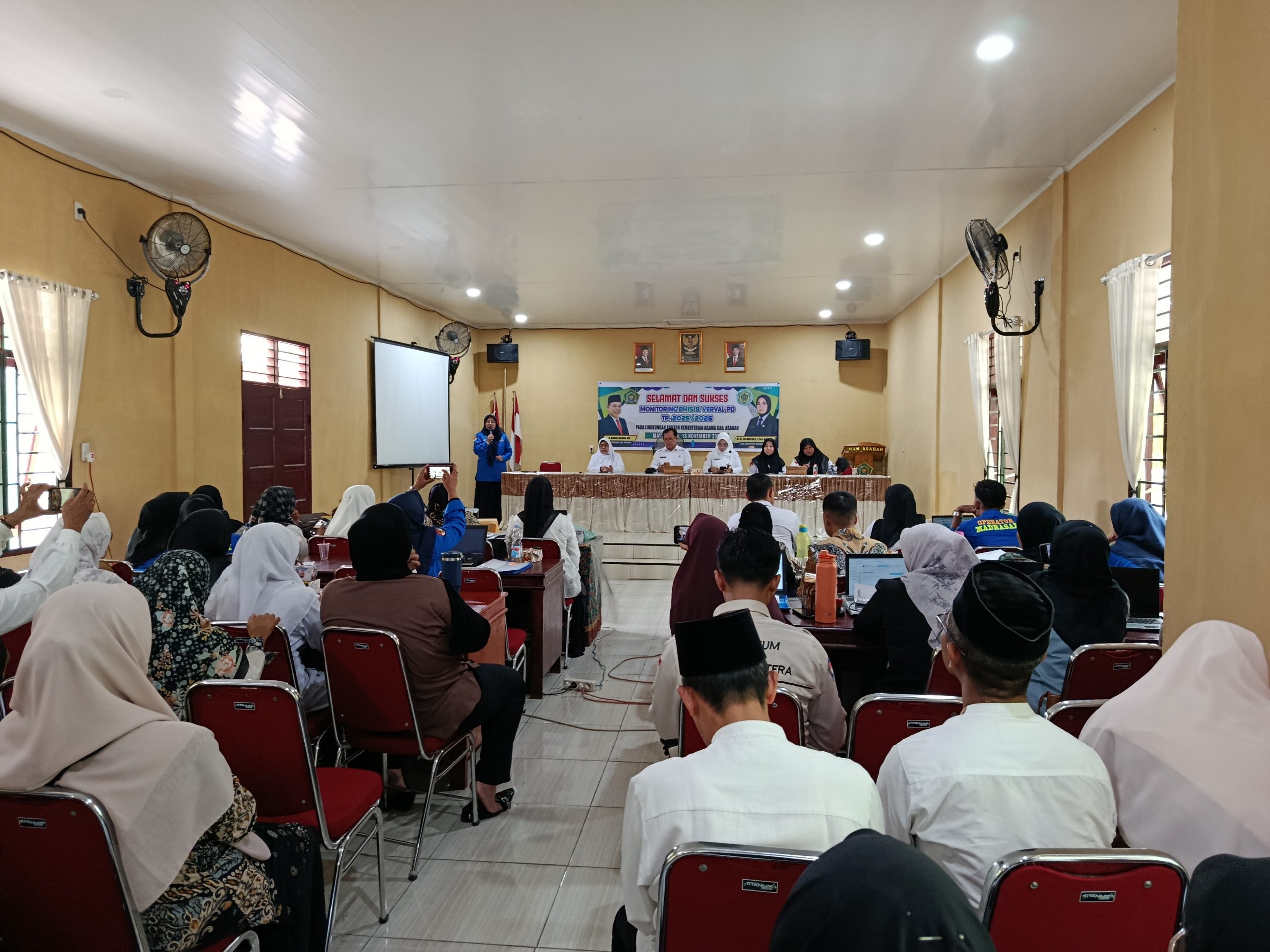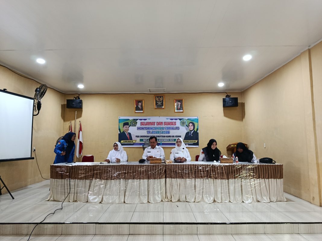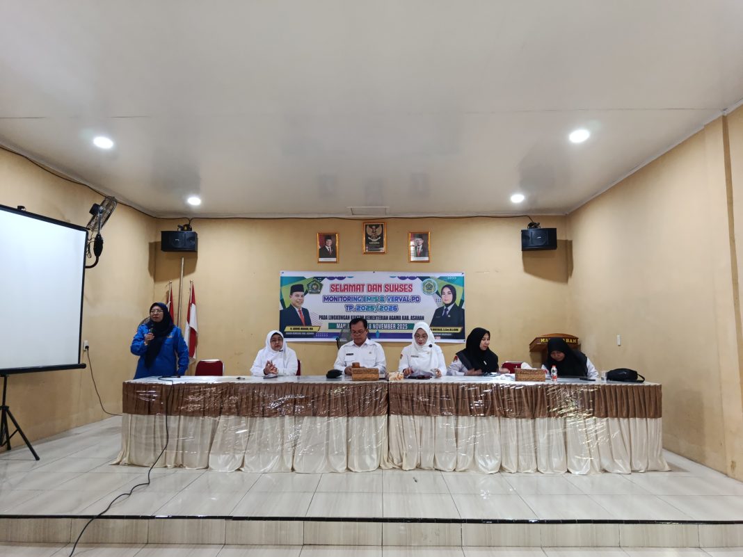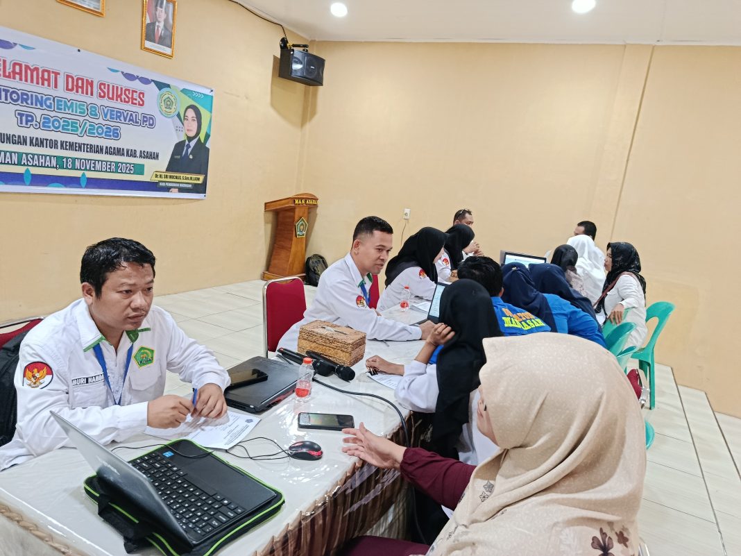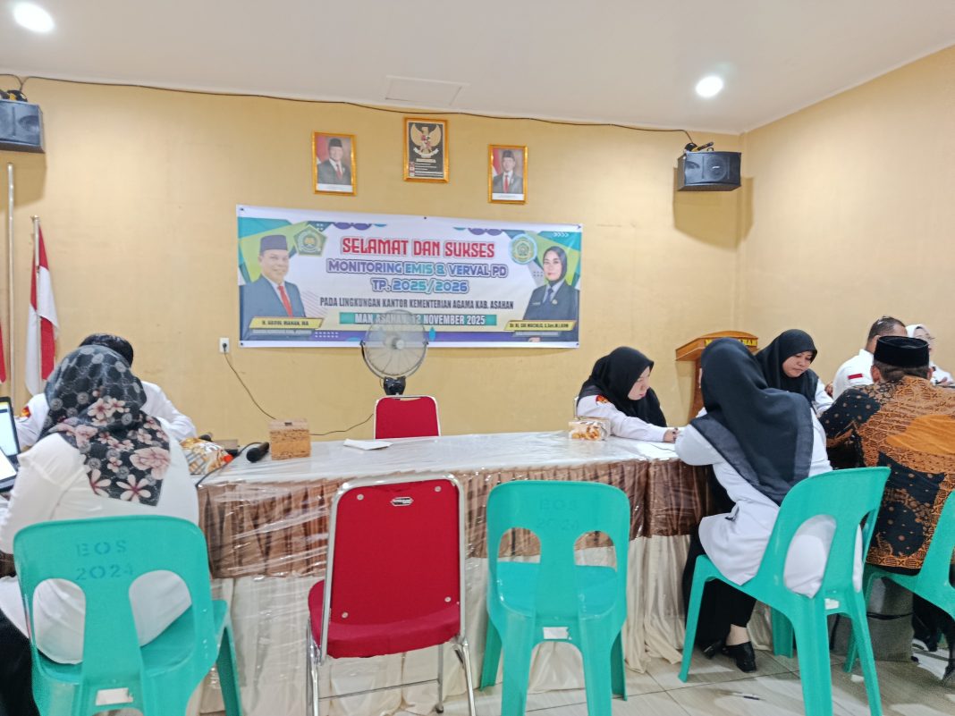Asahan (Humas). Kantor Kementerian Agama Kabupaten Asahan melalui Seksi Pendidikan Madrasah Kemenag Asahan kembali melakukan kegiatan Monitoring dan Evaluasi (Monev) Emis dan Verval PD untuk seluruh madrasah se-Kabupaten Asahan zona VII Tahun Pelajaran 2025/2026 yang dilaksanakan di MAN Asahan, Selasa (18/11/2025). Kegiatan ini dihadiri oleh Kakan Kemenag Asahan H. Abdul Manan, MA. didampingi oleh Kasi Penmad Kemenag Asahan Dr. Hj. Sri Muchlis, S. Sos., M. I. Kom. dan Kepala MAN Asahan Dra. Hj. Elda Ayumi, M. Si. serta seluruh staf Pendidikan Madrasah dan seluruh Kepala dan Opertor Madrasah yang berjumlah 64 madrasah.