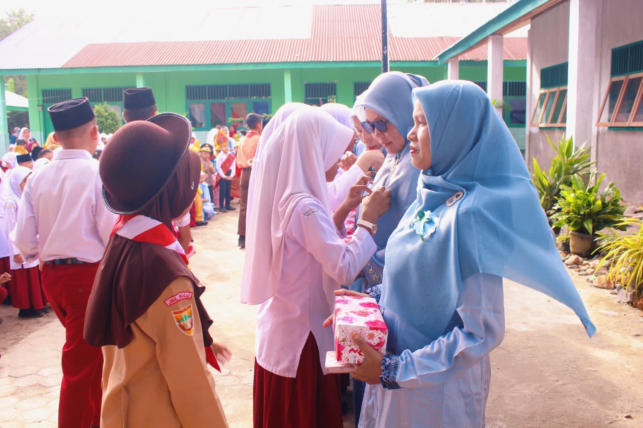 Setelah rangkaian upacara, kegiatan dilanjutkan dengan penyematan pin penghargaan oleh siswa kepada seluruh guru MIN 4 Asahan. Momen itu berlangsung dengan penuh kehangatan dan haru, mencerminkan kedekatan emosional antara siswa dan guru sebagai satu keluarga besar di madrasah. Para guru tampak terharu sambil tersenyum ketika menerima pin sebagai tanda penghormatan dan rasa terima kasih dari siswa.