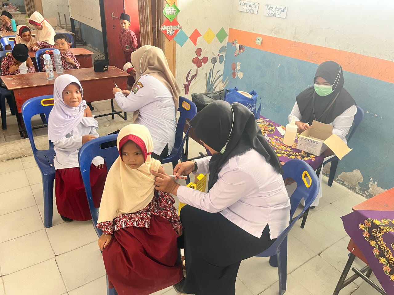 Kegiatan berlangsung tertib dan kondusif di ruang kelas yang telah disiapkan pihak madrasah. Para petugas melakukan pemeriksaan kesehatan awal, memastikan kondisi siswa, serta memberikan imunisasi sesuai sasaran dosis. Guru pendamping turut membantu menenangkan siswa agar proses berjalan lancar.