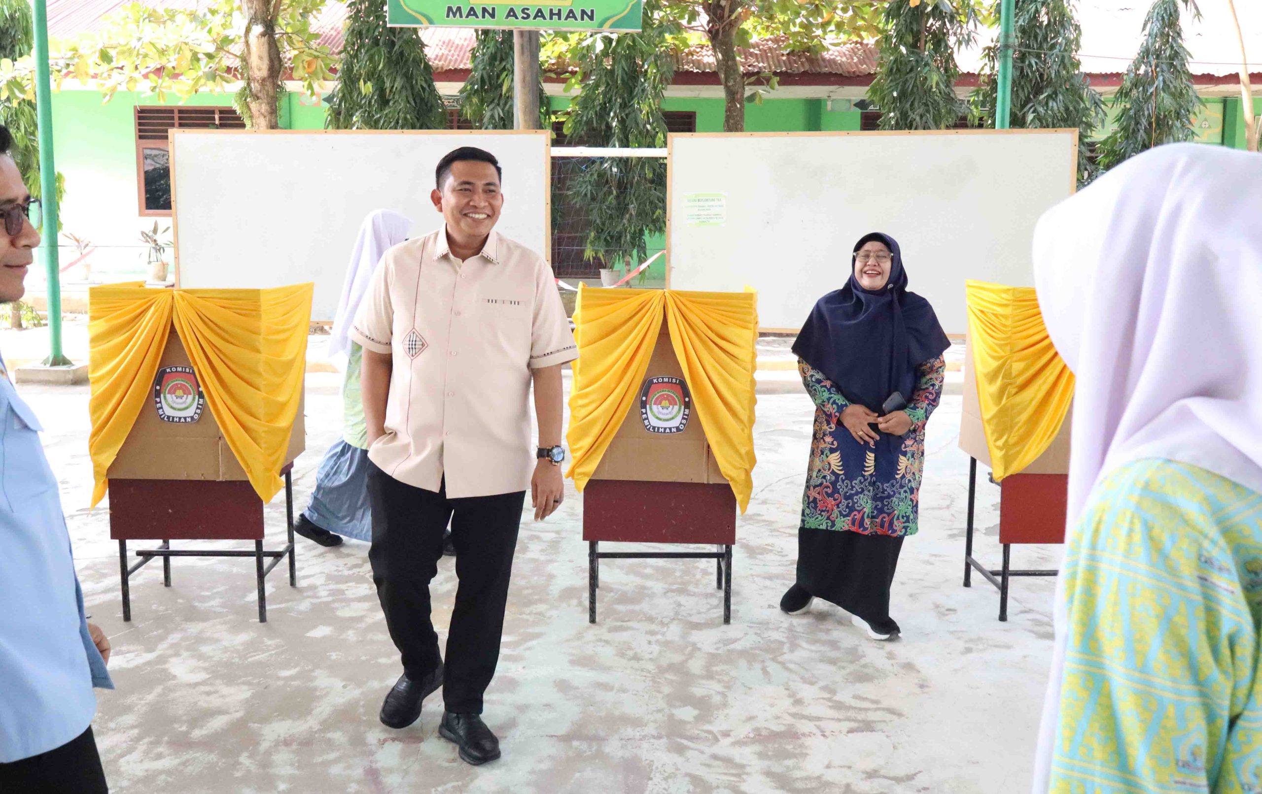 Kisaran (Humas). Kepala Bidang Pendidikan Madrasah (Kabid Penmad) Kantor Wilayah Kementerian Agama Provinsi Sumatera Utara, Dr. H. Erwin Pinayungan Dasopang, SE, M.Si, didampingi Kepala MAN Asahan Dra. Hj. Elda Ayumi, M.Si, serta Kepala Urusan Tata Usaha Kuswari, S.Kom, meninjau secara langsung pelaksanaan pemilihan Ketua dan Wakil Ketua Organisasi Siswa Intra Madrasah (OSIM) MAN Asahan masa bakti 2026/2027 di aula terbuka MAN Asahan, Rabu (11/2/2026).