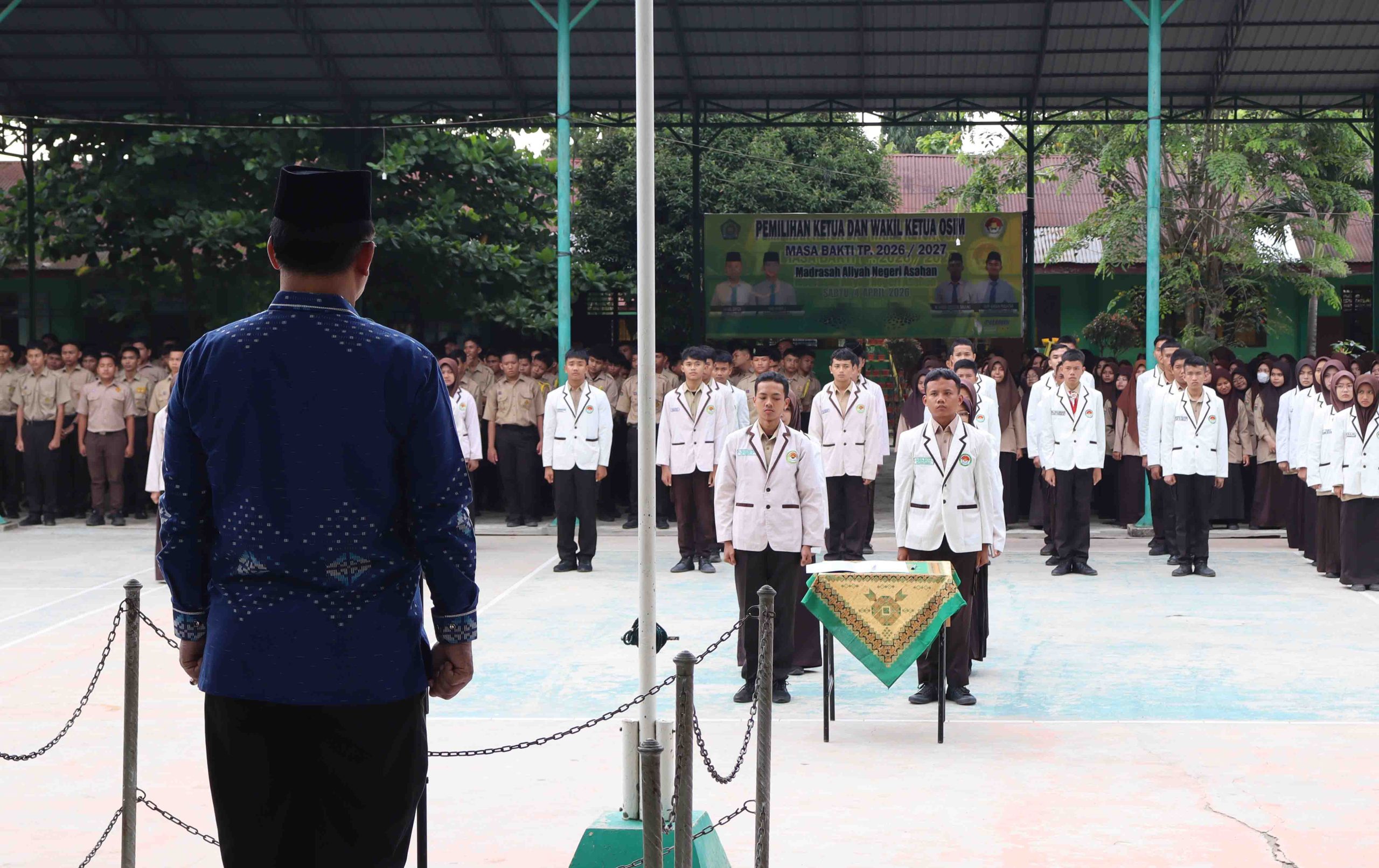 Kisaran (Humas). MAN Asahan menggelar upacara Pelantikan Pengurus Organisasi Siswa Intra Madrasah (OSIM) Masa Bakti 2026/2027 di lapangan MAN Asahan, Jumat (24/04/2026). Kegiatan tersebut berlangsung dengan tertib dan penuh khidmat, dihadiri oleh Kepala Kantor Kementerian Agama Kabupaten Asahan H. Abdul Manan, M.A., didampingi Kepala Seksi Pendidikan Madrasah Dr. Hj. Sri Muchlis, M.I.Kom, serta Kepala MAN Asahan Dra. Hj. Elda Ayumi, M.Si.